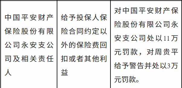 财米网 中国平安财产保险永安支公司因给予投保人保险合同约定以外的保险费回扣被罚款11万元 中国平安 来源:北京股票配资网APP下载 网站:九五配资 日期:2026-02-13 09:21:33 查看:87