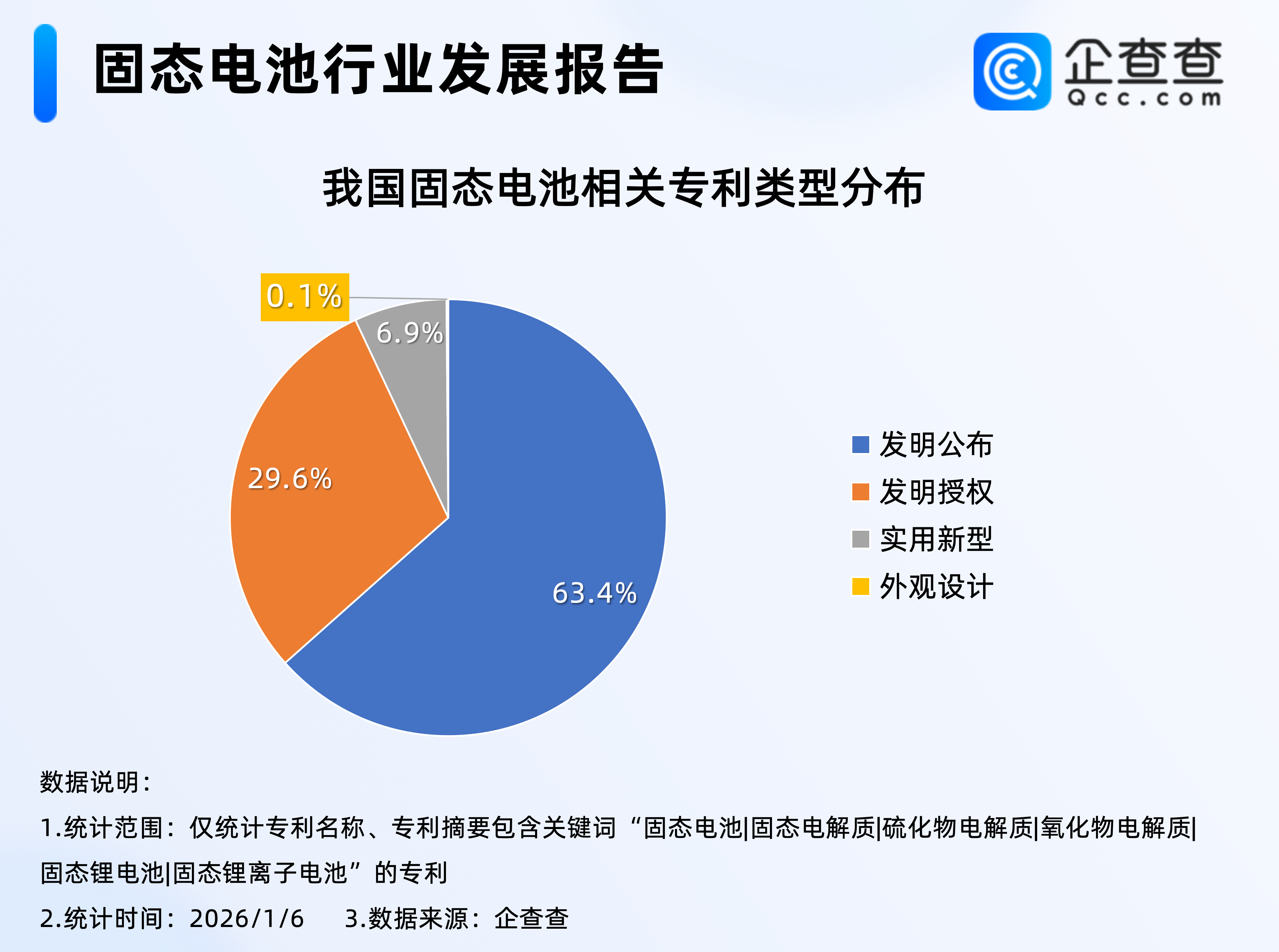 企查查数据显示,我国现有1.44万项固态电池相关专利,类型上以发明专利为主,占比超九成,其中发明公布占比63.4%,发明授权占比29.6%;外观设计类占比最少,为0.1%。