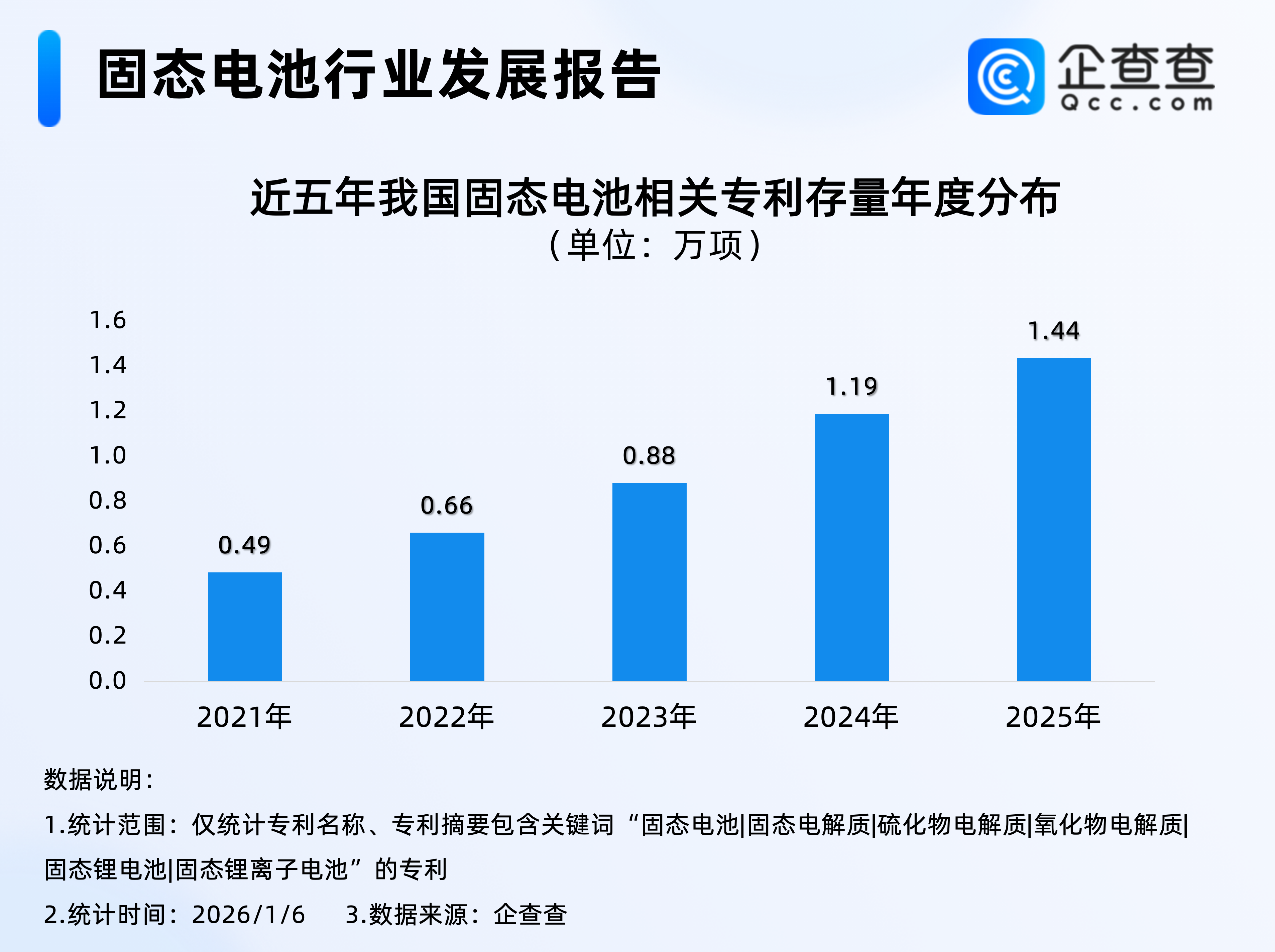 据媒体报道,在2026年CES展会上,DonutLab发布“全球首款可量产全固态电池”,据介绍,DonutLab的全固态电池提供400Wh/kg的能量密度,从而实现了更长的续航里程、更轻的结构,以及在车辆和产品设计中前所未有的灵活性。该电池仅需5分钟即可充满电,且无需将充电限制在80%以内,并支持安全、重复且可靠的全额放电。企查查数据显示,截至2025年年底,我国已有1.44万项固态电池相关专利。类型上以发明专利为主,占比超九成。固态电池正重构新能源产业格局,为汽车、储能等领域注入革命性动能。1.从专利数量来看:我国现有1.44万项固态电池相关专利